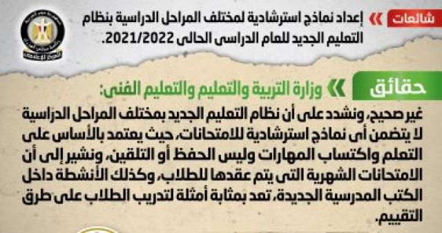 كشف المركز الإعلامي لمجلس الوزراء إنه فى ضوء ما تردد من أنباء بشأن إعداد نماذج استرشادية لمختلف المراحل الدراسية بنظام التعليم الجديد للعام الدراسي الحالي 2021/2022، تواصل المركز مع وزارة التربية والتعليم والتعليم الفني، والتي نفت تلك الأنباء، مُؤكدةً أنه لا صحة لإعداد نماذج استرشادية لمختلف المراحل الدراسية بنظام التعليم الجديد للعام الدراسي الحالي 2021/2022، مُشددةً على أن نظام التعليم الجديد بمختلف المراحل الدراسية لا يتضمن أي نماذج استرشادية للامتحانات، حيث يعتمد بالأساس على التعلم واكتساب المهارات وليس الحفظ أو التلقين، مُشيرةً إلى أن الامتحانات الشهرية التي يتم عقدها للطلاب، وكذلك الأنشطة داخل الكتب المدرسية الجديدة، تعد بمثابة أمثلة لتدريب الطلاب على طرق التقييم.