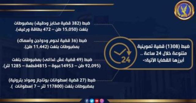 وأسفرت الحملات عن ضبط 1308 قضية تموينية متنوعة خلال 24 ساعة، أبرزها ضبط 382 قضية مخابز ودقيق بمضبوطات بلغت (15,050 طن – 472 بطاقة ورغي، وضبط 49 قضية غش غذائى بمضبوطات بلغت (92,095 طن – 14953عبوة – 4815قطعة – 1285 لتر)، وضبط 36 قضية لحوم ودواجن وأسماك بمضبوطات بلغت (11,442 طن)، وضبط 28 قضية غش غير غذائى بمضبوطات بلغت (45,335 طن – 1412 عبوة –162557قطعة – 280 متر)، وضبط 27 قضية إسطوانات بوتاجاز ومواد بترولية بمضبوطات بلغت (117800 لتر – 7 إسطوانات).