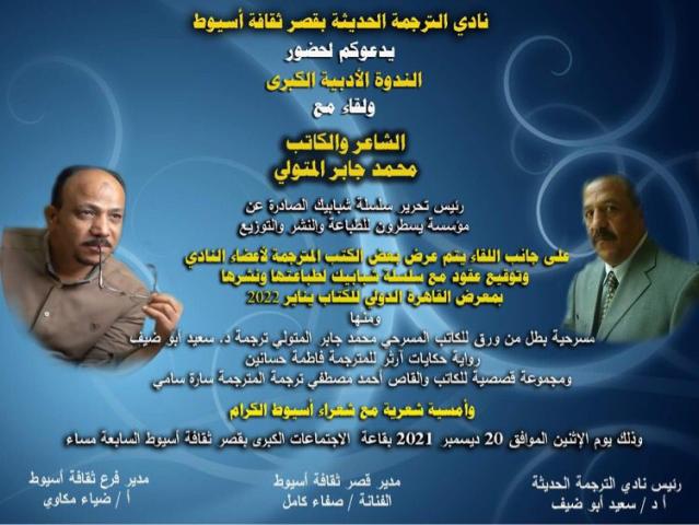 أوضح الدكتور سعيد أبو ضيف استاذ الترجمة بكلية الآداب جامعة أسيوط أن الندوة الأدبية ستتضمن لقاء مع الشاعر والكاتب محمد جابر المتولي رئيس تحرير سلسلة شبابيك الصادرة عن مؤسسة يسطرون للطباعة والنشر والتوزيع، ويعقبها أمسية شعرية مع شعراء أسيوط، بالإضافة إلى عرض بعض الاعمال الإبداعية المترجمة وتفهم طرق واساليب العمل المتنوعة للترجمة الأدبية، فضلاً عن توقيع عقود نشر لأول 3 كتب مترجمة عن نادي الترجمة، سيتم توقيعها بحضور المترجم والمؤلف والناشر والاخير هو مدير سلسلة شبابيك بمؤسسة يسطرون للطباعة والنشر والتوزيع وذلك لطباعتها ونشرها ضمن أعمال الدار وللمشاركة بها في معرض القاهرة الدولي للكتاب يناير 2022م.