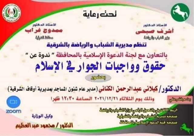 وفي هذا الإطار أشار الدكتور محمود عبد العظيم وكيل وزارة الشباب والرياضة إلي أنه تحت رعاية وزير الشباب والرياضة ومحافظ الشرقية وبالتعاون مع لجنة الدعوة الإسلامية بالمحافظة سوف تقوم المديرية بتنظيم ندوه دينية بعنوان " حقوق وواجبات الجوار في الإسلام " يتم عرضها اليوم الثلاثاء الموافق 21 ديسمبر في تمام الساعة الثانية عشر والنصف ظهرا ًعن طريق البث المباشر علي صفحة مكتب الربط الالكتروني والتحول الرقمي لوزارة الشباب والرياضة علي الفيس بوك وكذلك صفحة مديريه الشباب والرياضة بالشرقية وصفحة لجنه الدعوة الإسلامية بالمحافظة من خلال الروابط التالية:
