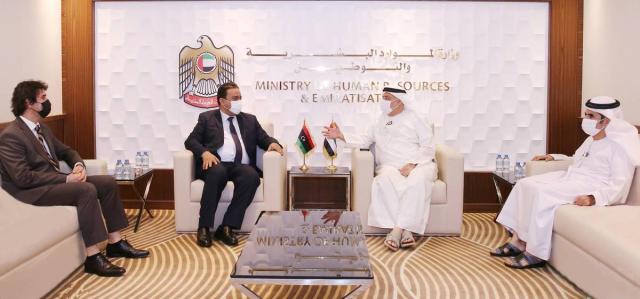 بحث وزير الموارد البشرية والتوطين الإماراتي الدكتور عبد الرحمن العور مع وزير العمل والتأهيل الليبي علي العابد الرضا، والوفد المرافق له، العلاقات الثنائية في مجالات العمل، وسبل تعزيز التعاون بين البلدين.