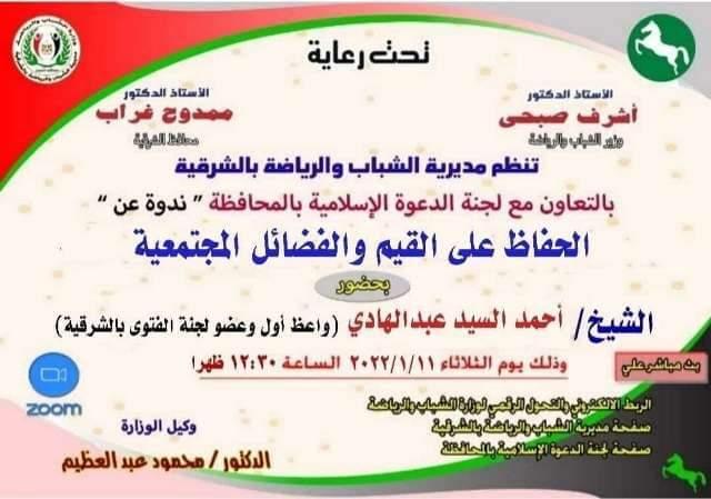 وفي هذا الإطار أشار الدكتور محمود عبد العظيم وكيل وزارة الشباب والرياضة إلي أنه تحت رعاية وزير الشباب والرياضة ومحافظ الشرقية وبالتعاون مع لجنة الدعوة الإسلامية بالمحافظة سوف تقوم المديرية بتنظيم ندوه دينية بعنوان " الحفاظ على القيم والفضائل المجتمعية " يتم عرضها اليوم الثلاثاء الموافق 11 يناير 2022 في تمام الساعة الثانية عشر والنصف ظهرا ًعن طريق البث المباشر علي صفحة مكتب الربط الالكتروني والتحول الرقمي لوزارة الشباب والرياضة علي الفيس بوك وكذلك صفحة مديريه الشباب والرياضة بالشرقية وصفحة لجنه الدعوة الإسلامية بالمحافظة من خلال الروابط التالية: