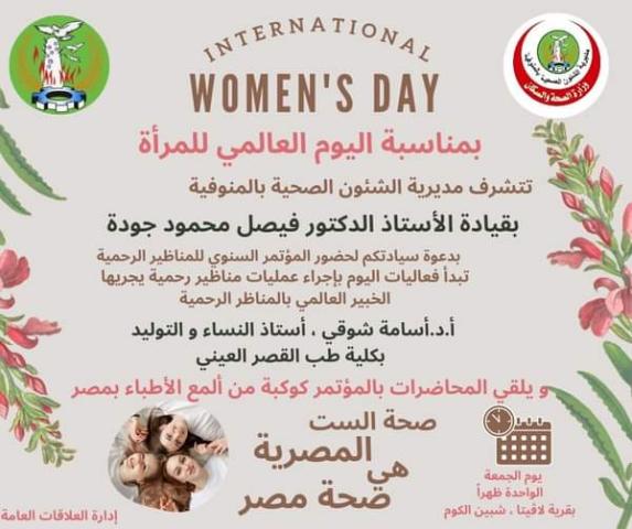 تنظم مديرية الشئون الصحية بالمنوفية المؤتمر السنوي للمناظير الرحمية يوم الجمعة القادم تزامناً مع اليوم العالمي للمرأة تحت رعاية الدكتور خالد عبد الغفار وزير التعليم العالي و القائم بأعمال وزير الصحة و السكان واللواء إبراهيم أبو ليمون محافظ المنوفية وبتوجيهات ودعم الأستاذ الدكتور فيصل محمود جودة وكيل صحة المنوفية إيماناً من سيادته بأهمية دور المرأة في المجتمع وإيماناً بأن صحة المرأة المصرية هي صحة مصر وعرفاناً لها بالجميل في يوم المرأة العالمي.