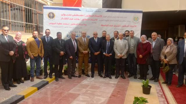 بحضور كل من الدكتورأشرف عبد الباسط- رئيس جامعة المنصورة، الأستاذ الدكتور محمد عطية البيومى- نائب رئيس الجامعة لشئون التعليم والطلاب، الدكتورأشرف شومة - عميد كلية الطب، وكلاء الكلية ، أعضاء لجنة التأريخ لليوبيل الذهبى لجامعة المنصورة، عدد من أساتذة الجامعة.