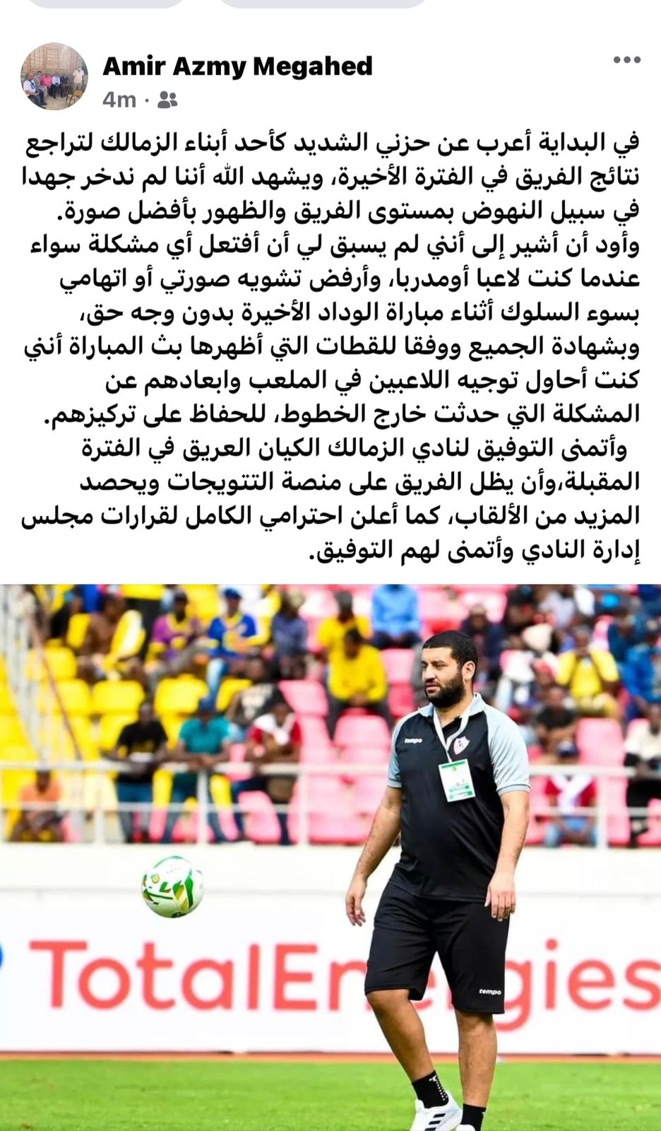 وأتمنى التوفيق لنادى الزمالك الكيان العريق فى الفترة المقبلة،وأن يظل الفريق على منصة التتويجات ويحصد المزيد من الألقاب، كما أعلن احترامى الكامل لقرارات مجلس إدارة النادى وأتمنى لهم التوفيق".