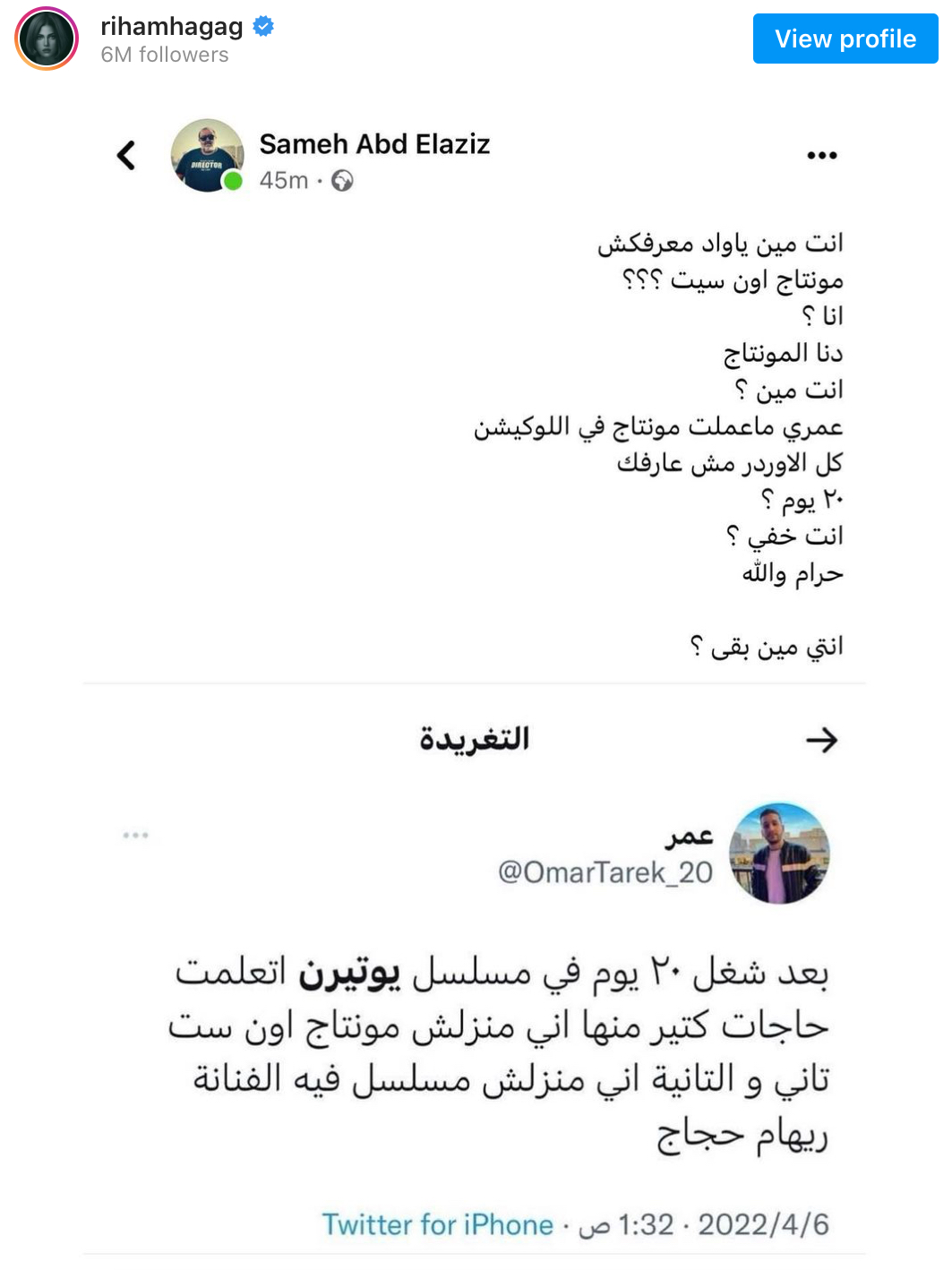 ريهام أعادت مشاركة منشور لمخرج مسلسلها "يوتيرن" سامح عبد العزيز، يرد فيه على شخص يدعى عمر طارق قال إنه عمل لمدة 20 يوما بوحدة مونتاج المسلسل ونادم على التعاون مع ريهام حجاج ولن يكرر هذا مستقبلا.
