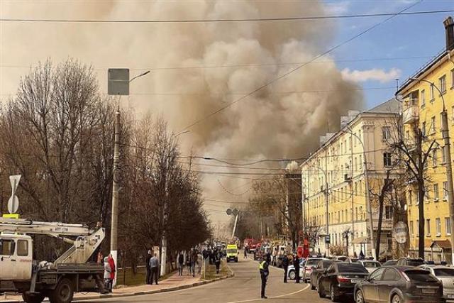 بثّ التلفزيون الروسي صورا لدخان أسود كثيف يتصاعد فوق مبنى مهيب مكون من أربعة طوابق ويتبع لمعهد البحوث المركزي للقوات الجو-فضائية الروسية.