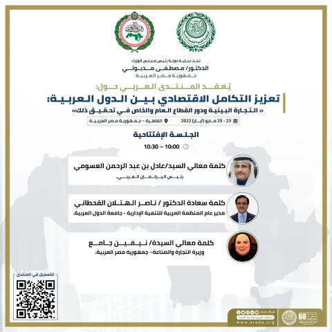 ينطلق غدا الإثنين بالقاهرة، منتدى تعزيز التكامل الاقتصادي بين الدول العربية: "التجارة البينية ودور القطاع العام والخاص في تحقيق ذلك"، في نسخته الأولى والذي ينظمه البرلمان العربي والمنظمة العربية للتنمية الإدارية على مدى ثلاثة ايام برعاية رئيس مجلس الوزراء الدكتور مصطفى مدبولي.