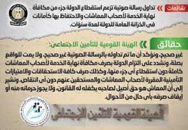 أعلن المركز الإعلامي لمجلس الوزراء نفي الرسالة الصوتية التي تداولت عن إستقطاع جزء من مكافأة نهاية الخدمة لأصحاب المعاشات والأحتفاظ بها في خزنة الدولة كأمانات للعديد من السنوات ونفي أيضا التأمين الأجتماعي هذة الشائعات