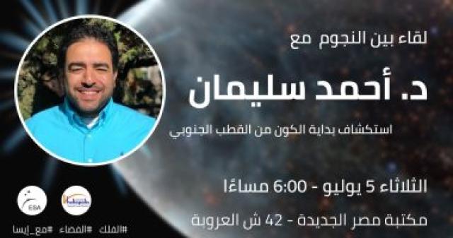 تستضيف مكتبة مصر الجديدة بمقرها فى 42 شارع العروبة بمصر الجديدة، فى السادسة من مساء بعد غدٍ الثلاثاء 5 يوليو، الدكتور أحمد سليمان الباحث فى مجال الهندسة والفيزياء الفلكية بـ "معهد كاليفورنيا للتكنولوجيا - جامعة كالتك" و"مختبر الدفع الصاروخى بوكالة الطيران والفضاء الأمريكية - ناسا" بكاليفورنيا – الولايات المتحدة الأمريكية، في لقاء بين النجوم ليستكشف بداية الكون في رحلة من القطب الجنوبي إلى أعماق الفضاء السحيق.