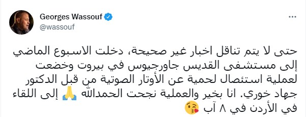 وكتب جورج وسوف تغريدة على تويتر "حتى لا يتم تناقل أخبار غير صحيحة، دخلت الأسبوع الماضي إلى مستشفى القديس جاورجيوس في بيروت وخضعت لعملية استئصال لحمية عن الأوتار الصوتية من قبل الدكتور جهاد خوري. انا بخير والعملية نجحت الحمد الله.. إلى اللقاء في الأردن في ٨ آب".
