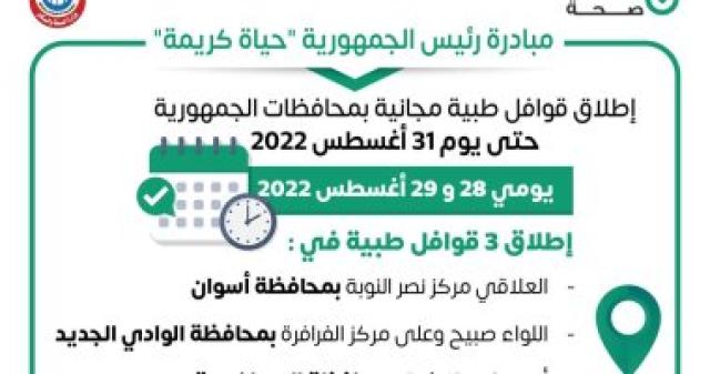 وأضافت وزارة الصحة والسكان، أن المحافظات المقرر إجراء القوافل بها تشمل محافظات أسوان والوادى الجديد والأسكندرية.