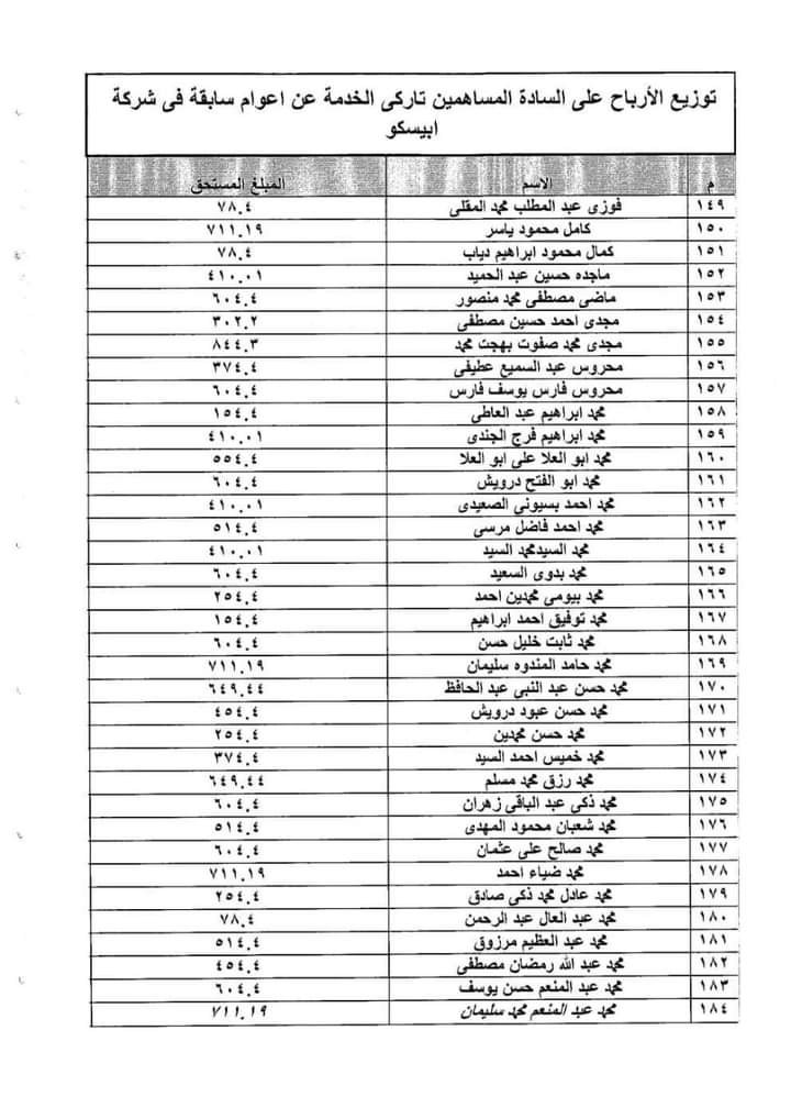 وشملت القائمة اسماء العديد من العاملين الذين تنشر بترو مصر كشوفا بها لسرعة تقدمهم الي ادارة ابسكو لصرف حقوقهم المالية.