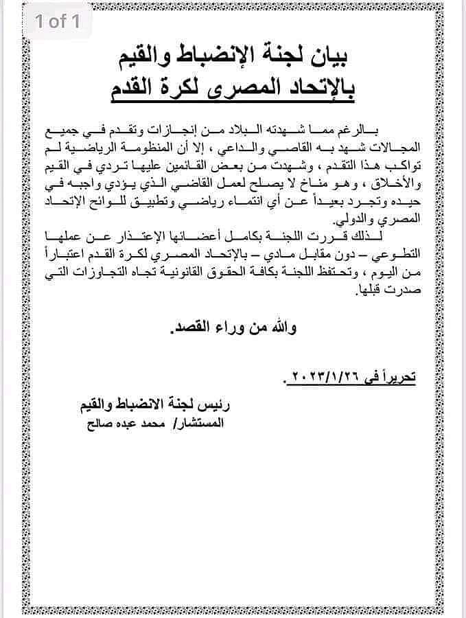 وأختتم البيان: "لذلك قررت اللجنة بكامل أعضائها الاعتذار عن عملها التطوعي - دون مقابل مادي - بالاتحاد المصري لكرة القدم اعتبارًا من اليوم، وتحتفظ اللجنة بكافة الحقوق القانونية تجاه التجاوزات التي صدرت قبلها".